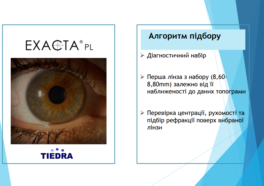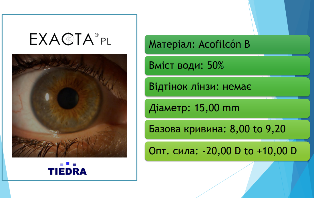 Exacta PL – кастомізовані м’які контактні лінзи, що завдяки своїй формі можуть бути підібрані для пацієнтів з екстремально плоскою рогівкою, наприклад після лазерної корекції та насічок