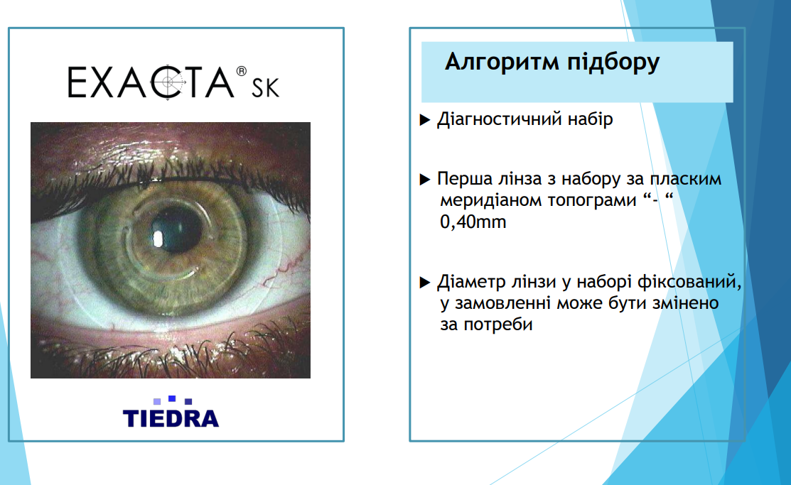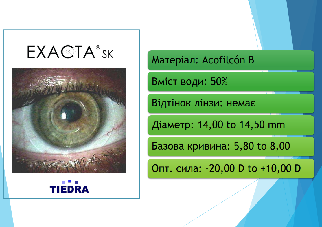 Exacta SK – кастомізовані лінзи, що завдяки збільшеній товщині та щільності утримують свою форму й коригують іррегулярну рогівку з крутим профілем